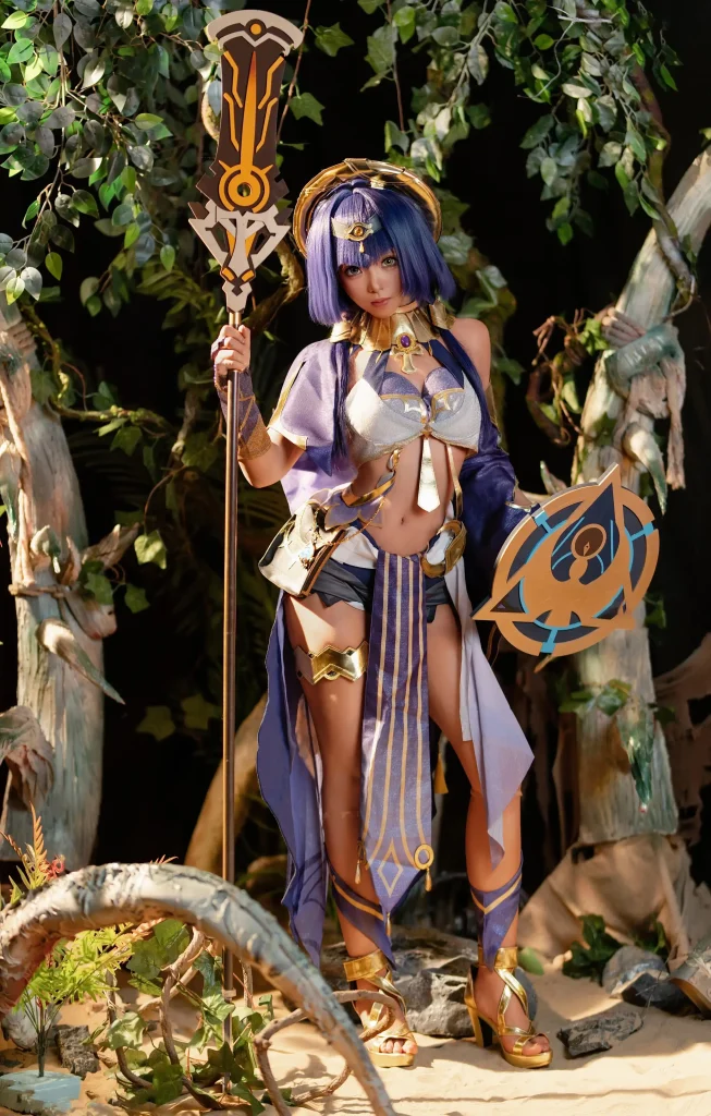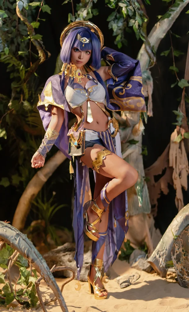 Bangni邦尼这套cos造型高度还原坎蒂丝的标志性设计:紫金色抹胸上衣搭配同色系流苏长袍,金色饰件与宝石点缀细节拉满,完美复刻了角色的异域贵族气质;蓝紫色短发搭配金色头环与额间眼形饰件,精准还原了坎蒂丝的角色特征,让Bangni邦尼坎蒂丝cos更具辨识度。服饰上的金色纹路、流苏挂饰与腿部护甲,每一处细节都贴合角色设定,搭配金色高跟凉鞋,将坎蒂丝的御姐气场展现得淋漓尽致。