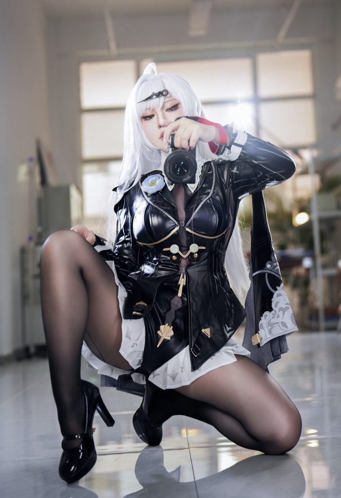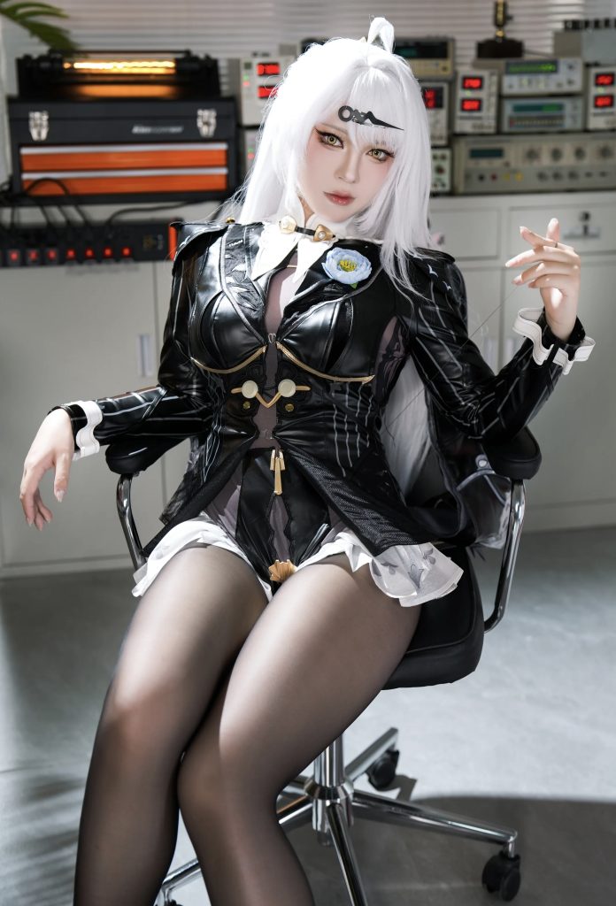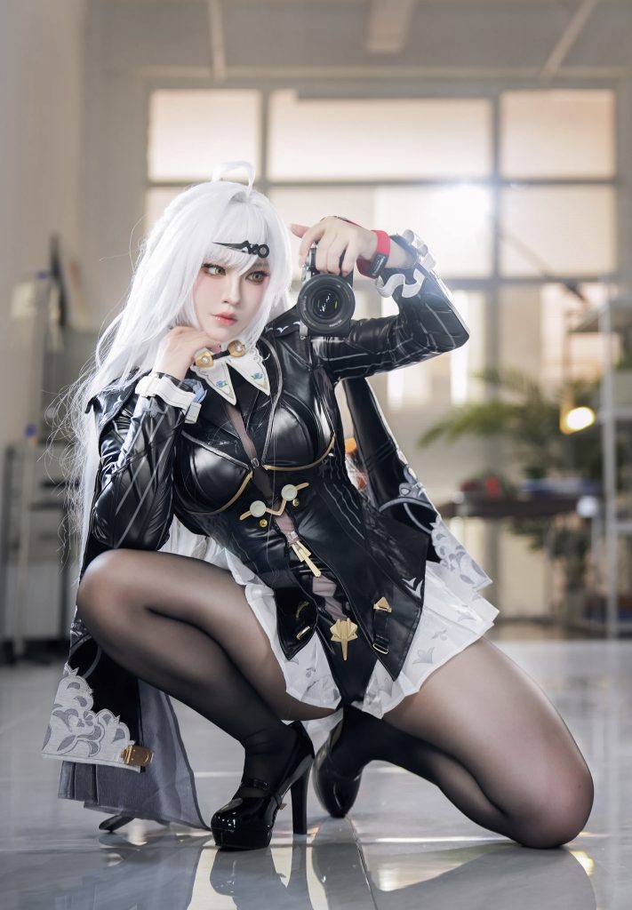 半半子这套cos造型高度还原角色设计:黑色亮面皮质制服,搭配金色饰件与白色荷叶边裙摆,完美复刻了儀玄師匠的科技感造型;银白长发搭配角色同款发饰,精准还原了角色的标志性特征,让半半子儀玄師匠cos更具辨识度。服饰上的细节纹路、配饰设计与黑丝高跟鞋,每一处都贴合角色设定,将角色的御姐气场展现得淋漓尽致。